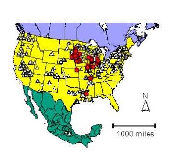 | How do I get started? Go to the species list, click on a species name, and see a species page. Alternatively, you can simply page through the species lists and "browse". In a future version, we plan to have the pages cross-linked so that assemblages can be presented. What is a Species Page? A Species Page shows the species name, author, and year described (see Taxonomy References for sources), species image(s) of the ostracode shells, Presence-Absence Distribution, and Distribution in Solute Space. What does the North America map show? Species Presence-Absence Distribution: (See right column for example). Each species page in NANODe shows the distribution map of sample sites (white triangles). Red circles indicate those sites where the particular species was found living and white triangles indicate the sites were sampled for ostracodes, but that particular species was not found. What are the images? Species Images: Each species page in NANODe shows at least one image of the ostracode shell with a scale bar: in some cases, males and females are imaged, in other cases, there may be an image of the shell and also a close-up of a particular shell feature. In a few instances, we have not yet posted an image: we hope to attend to those shortly when we acquire pristine shells that will photograph well. What does the graph show? Species Distribution in Solute Space: Non-marine ostracodes have demonstrated preferences for specific ranges of major ion concentration and composition. We find the most useful way of portraying these preferences is by plotting their distributions in hydrochemical or solute space (see graph on right). |