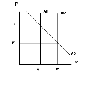 Let’s trace out what happens when productivity increases faster than expected. Figure 11-1 shows what happens when an exogenous increase in total factor productivity shifts the long run aggregate supply curve from AS to AS’. As you can see, output rises from Y to Y’. |
