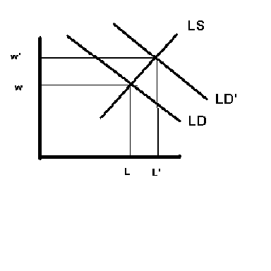 First, the higher level of economic activity increases labor demand from LD to LD’, and as the Figure 11-2 shows, an increase in the demand for labor increases both the number of people employed from L to L’, but also increases the real wage rate from w to w’. |