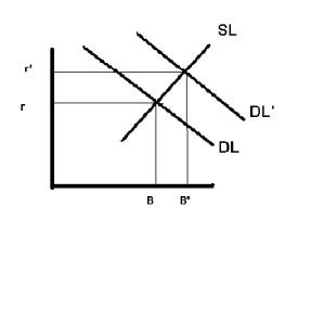Remember our graph for the demand and supply of loans for investment purposes. Not only does the higher level of economic activity increase the demand for existing capital, it also increases the demand for new capital. While firms are using old clunkers, it would be better to replace them with new equipment. As Figure 11-4 shows, this increases the Demand for Loans from DL to DL’, thus raising the interest rate as well as the quantity of loans being made from B to B’. That is, of course, another way of saying that the level of investment is going up. |