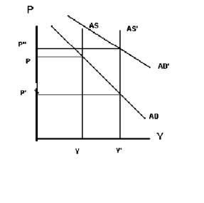 Thus the higher consumption and real interest rate which increases velocity cause increases aggregate demand. The net impact may be like that illustrated in Figure 11-5, where the combined impact of the increase in aggregate supply and aggregate demand leads to a higher price level, P’’. |