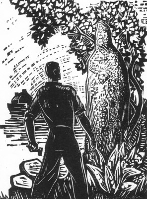 241: "Il brandit son marteau de fer, haut au-dessus de sa tête, et en asséna un coup contre le visage de pierre."