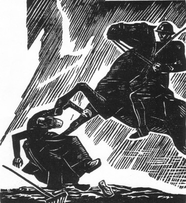 121: "Et Naïg au Dos d'or roula sur le pavé, brutalement, elle d'un côté, son rateau et un chausson de l'autre, sous les pieds des chevaux."