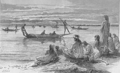 Here is the author's drawing of the fishermen returning in their pirogues. And here a Gauguin painting of a Tahitian family and their pirogue, E527 Te vaa; La pirogue 1896 (St. Petersburg: Hermitage). The island in the background is Moorea, of which more later.