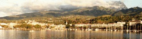 Here is Papeete today as seen from an approaching ship at evening. The city is much larger than at the time of the story, but the effect of the sunset is still "magique" and "enchanteur."