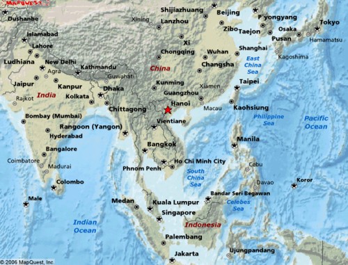 Voici une carte de l'Asie qui indique Hanoï (l'étoile rouge au centre)