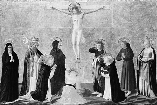 Voyez ci-dessous un tableau du Moyen Age (c. 1440), de Fra Angelico, qui représente le Christ avec nimbe et côté droit percé. Vous pouvez voir le sang et l'eau qui en sortent. Les autres présents, qui seront tous des saints, ont eux aussi des nimbes.