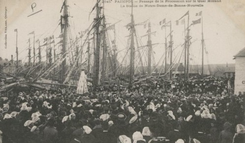 Voici une photo d'un reposoir sur le quai de Paimpol, à l'époque d'une bénédiction des départs. Si vous regardez de près, vous pouvez voir la statue de la Vierge, Notre Dame de Bonne Nouvelle. Sa statue est toujours à l'église de Paimpol.