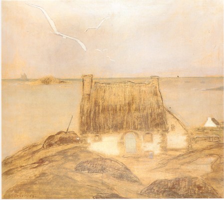 toit de paille et, derrière tout cela, les infinis crépusculaires, le vide incolore