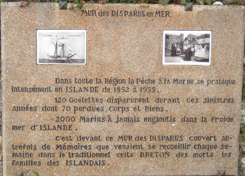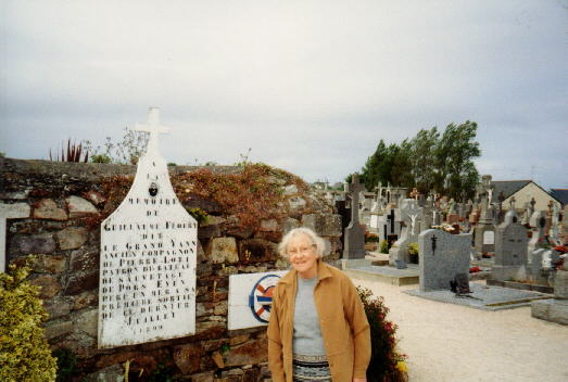 Mais ce qui, pour moi, a rendu la tragédie de cette vie réelle fut la rencontre fortuite avec Mme Annette Guilcher, que vous voyez ci-dessous. Elle est fille et petite fille d'Islandais, elle a vu le dernier départ des "Islandais", en 1935, pour faire la pêche en Islande, et pendant plus d'une heure elle m'a raconté les tristes événements de leur vie. Elle m'a accordé cette photo à côté de la plaque qui marque la tombe de Guillaume (Yann) Floury, le frère de sa grand-mère, et l'homme qui, dit-on, a servi de modèle à Loti pour Yann Gaos. Comme vous pouvez lire sur la plaque, cependant, ce Yann, quoique mort à la mer, n'est pas mort en Islande, mais près de Pors-Even, où il était patron d'un bateau de sauvetage qui a coulé en 1899, treize ans après la publication de Pêcheur d'Islande.