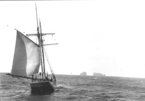 Une goélette navigant devant les rochers de Tvisker sur la côte sud-est d'Islande