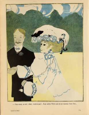 15. Patrick Cardon, "Caricature," and Louis-Georges Tin, "Littérature," Dictionnaire de l'homophobie, ed. Louis-Georges Tin (Paris: Presses universitaires de France, 2003), discuss the depiction of Loti as gay in various satyrical Parisian publications of the time, which associated him with notoriously gay Frenchman like Jean Lorrain and Robert de Montesquiou (78-9, 265). In their April 25, 1903 issue, for example, L'Assiette au Beurre published a cartoon in which a woman holding a copy of Mon frère IV by Pierlo To addresses a flower-sniffing, overly-bejeweled man with the line: "Allons donc, mon cher! ... Vous n'avez même pas l'excuse d'être dans la marine!" Edmond de Goncourt, in his famous and often malicious diary, repeatedly declared that Loti was sexually interested in men (Journal, ed. Robert Ricatte [Paris: Fasquelle, 1956] 3:1230, 4:227, etc.). As early as 21 February, 1888, when Loti showed up at a dinner hosted by novelist Alphonse Daudet with a handsome sailor in tow, Goncourt had wondered: "Is this homosexuality that he presents really sincere?" (3:758), and that same issue of L'Assiette au Beurre also featured a cartoon in which a fashionably dressed woman out for a stroll with her husband asks some third unseen party "Vous venez, ce soir, dîner, n'est-ce pas? . . . Nous avons Pierre Loti et son nouveau frère Yves." Given this context, that Loti chose to write a play about people who are persecuted for something in which they believe very deeply rather than for something of which they are innocent is worth remarking.
